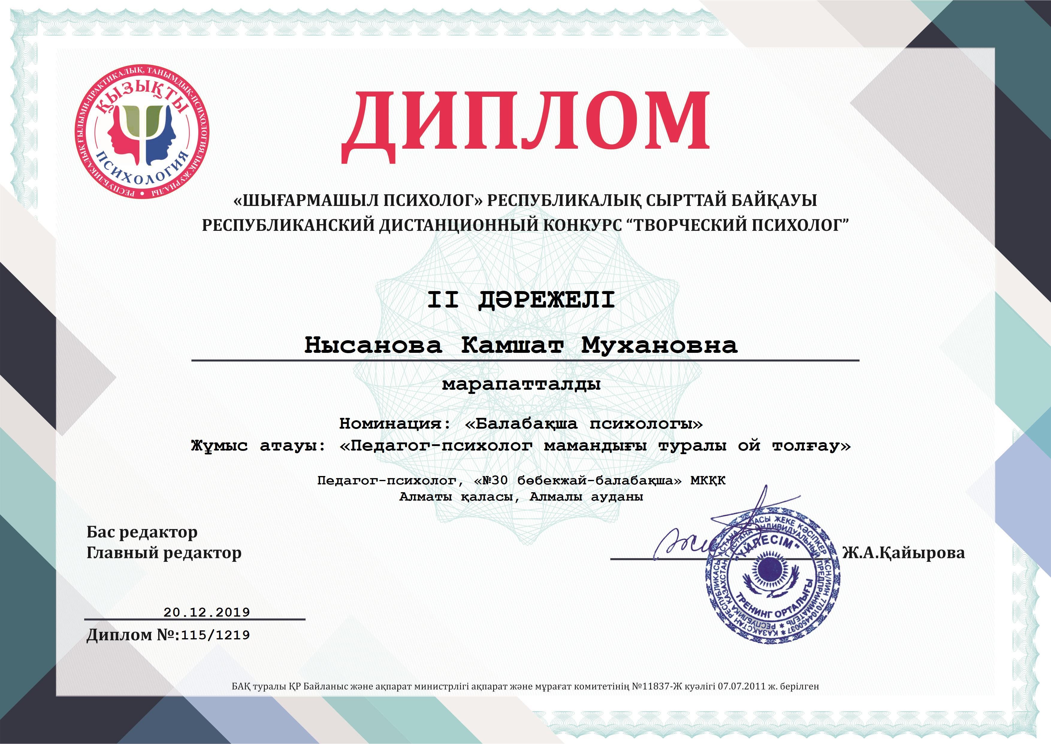 20 желтоқсан 2019 0 1 2 3 4 5 "ШЫҒАРМАШЫЛ ПСИХОЛОГ" байқауы! "Шығармашыл психолог" республикалық сырттай байқауына "Балабақша психологы" номинациясы бойынша "Педагог- психолог мамандығы туралы ой толғау" тақырыбымен қатысып, жүлделі ІІ орын алғаны үшін педагог-психологНЫСАНОВА КАМШАТ МУХАНОВНАмарапатталды.