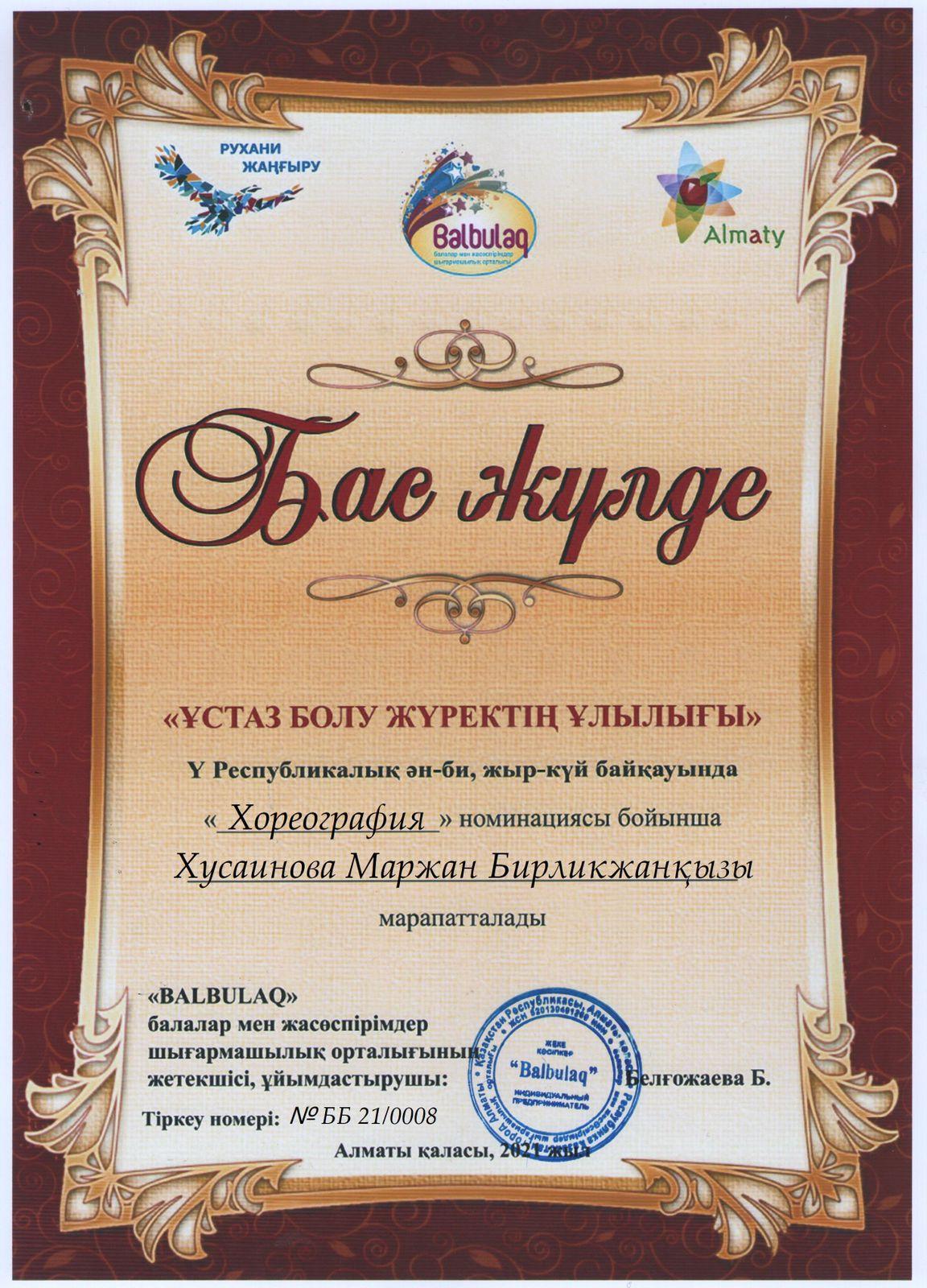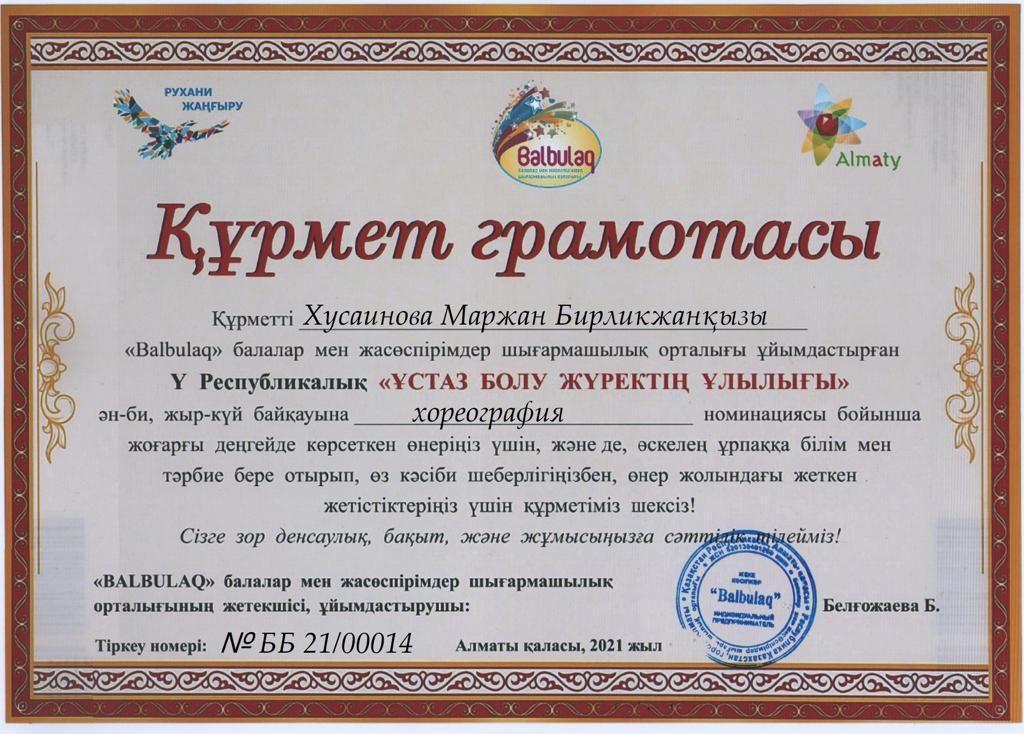 21 қазан 2021 0 1 2 3 4 5 V Республикалық "Ұстаз болу жүректің ұлылығы" ән-би, жыр-күй байқауы Тәрбиешіміз Хусаинова Маржан Бирликжанқызының жетістігі!