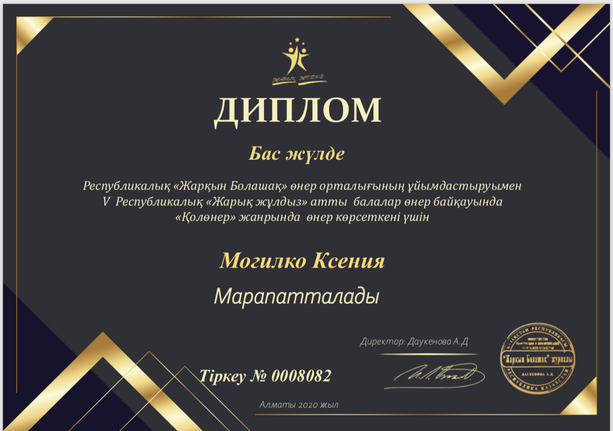 10 желтоқсан 2020 0 1 2 3 4 5 Балалар жетістіктері Республикалық "Жарқын Болашақ" өнер орталығы ұйымдастырғанРеспубликалық "Жарық Жұлдыз" балалар өнер байқауында "Қолөнер" жанрында балабақша тәрбиеленушісіМогилко Ксения Бас жүлде иеленді.