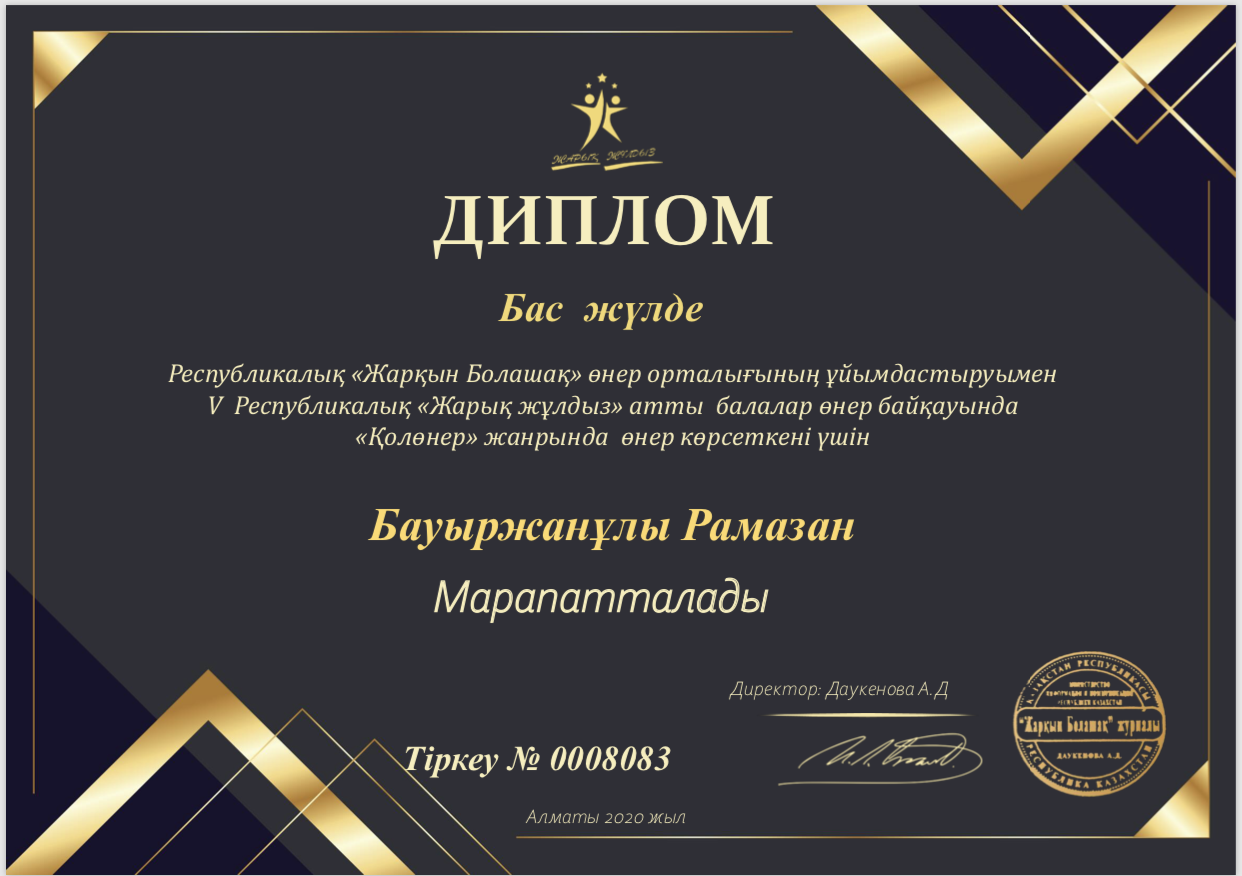 10 желтоқсан 2020 0 1 2 3 4 5 Балалар жетістіктері Республикалық "Жарқын Болашақ" өнер орталығы ұйымдастырған Республикалық "Жарық Жұлдыз" балалар өнер байқауында "Қолөнер" жанрында балабақша тәрбиеленушісі Бауыржанұлы Рамазан Бас жүлде иеленді.