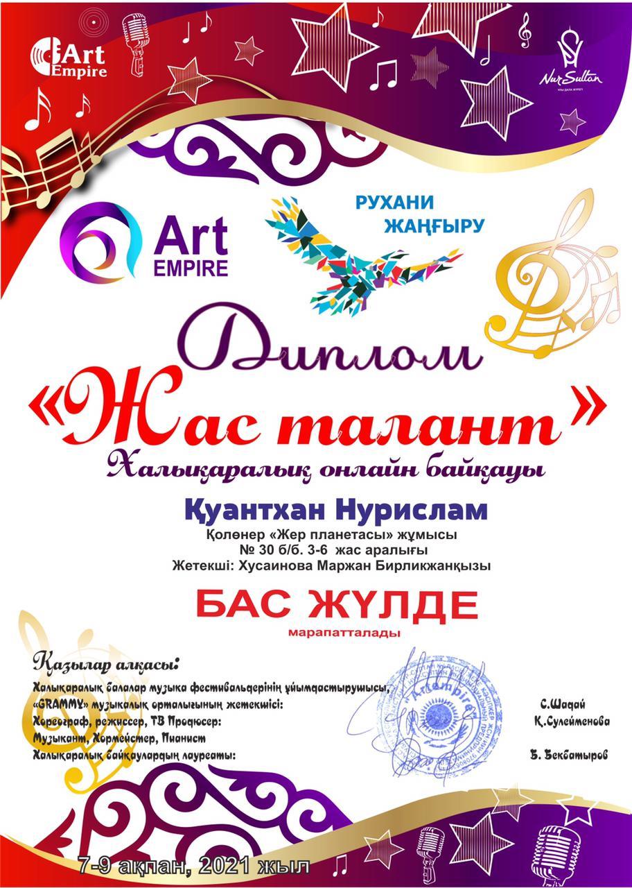 09 ақпан 2021 0 1 2 3 4 5 Жас талант Қуантхан Нурислам "Жас талант" Халықаралық онлайн байқауында Қол өнер номинациясымен "Жер планетасы" жұмысымен қатысып иеленді Қуантхан Нурислам Бас жүлде