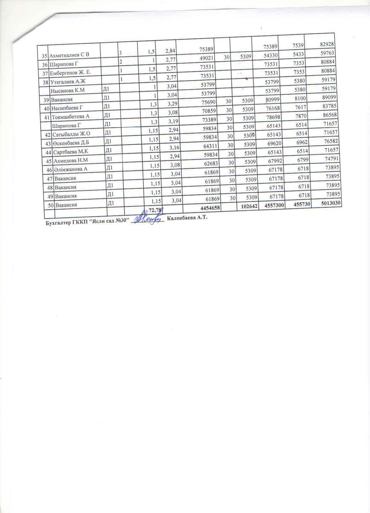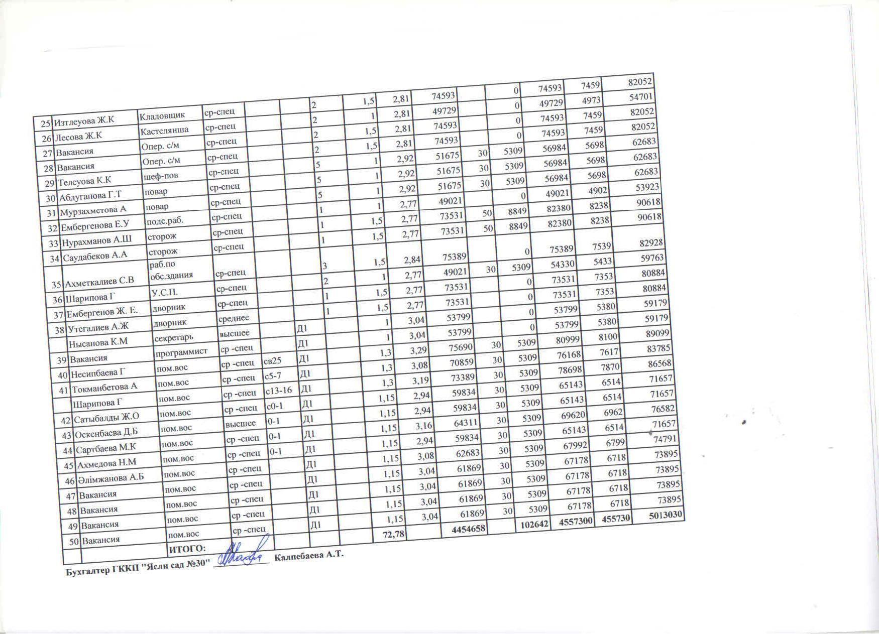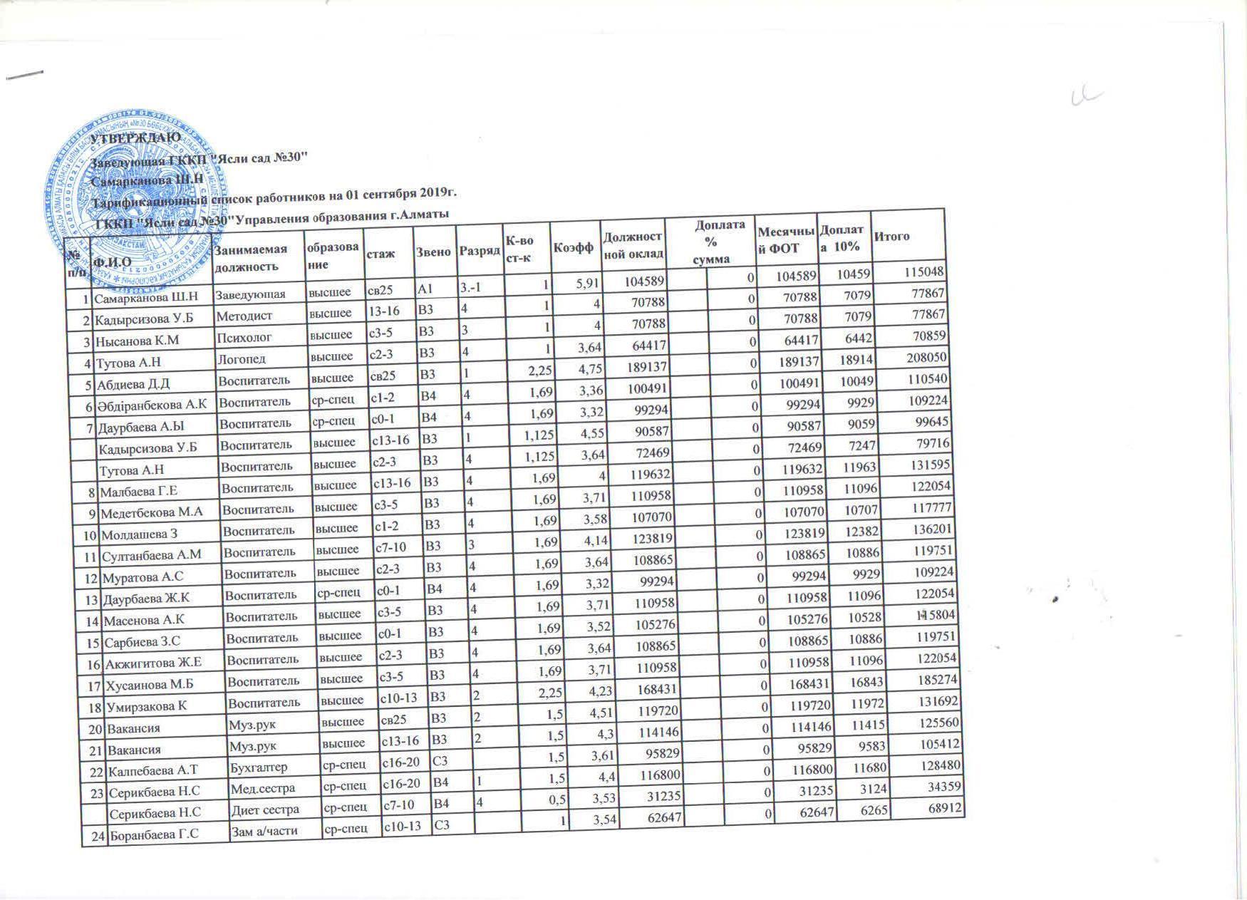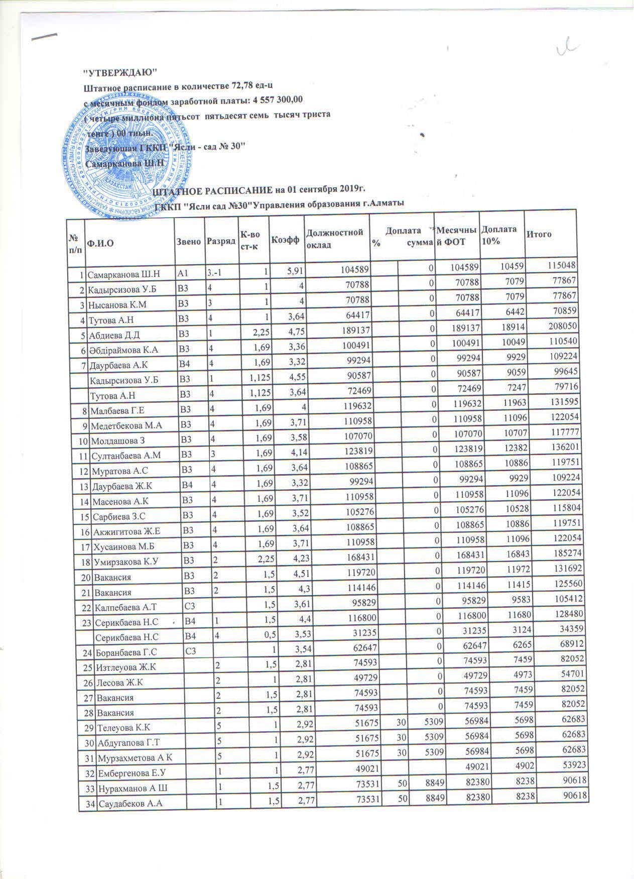 Штатное расписание и тарификационный список на 01.09.2019 » КГКП "Ясли сад №30". мемлекеттік балабақшасы