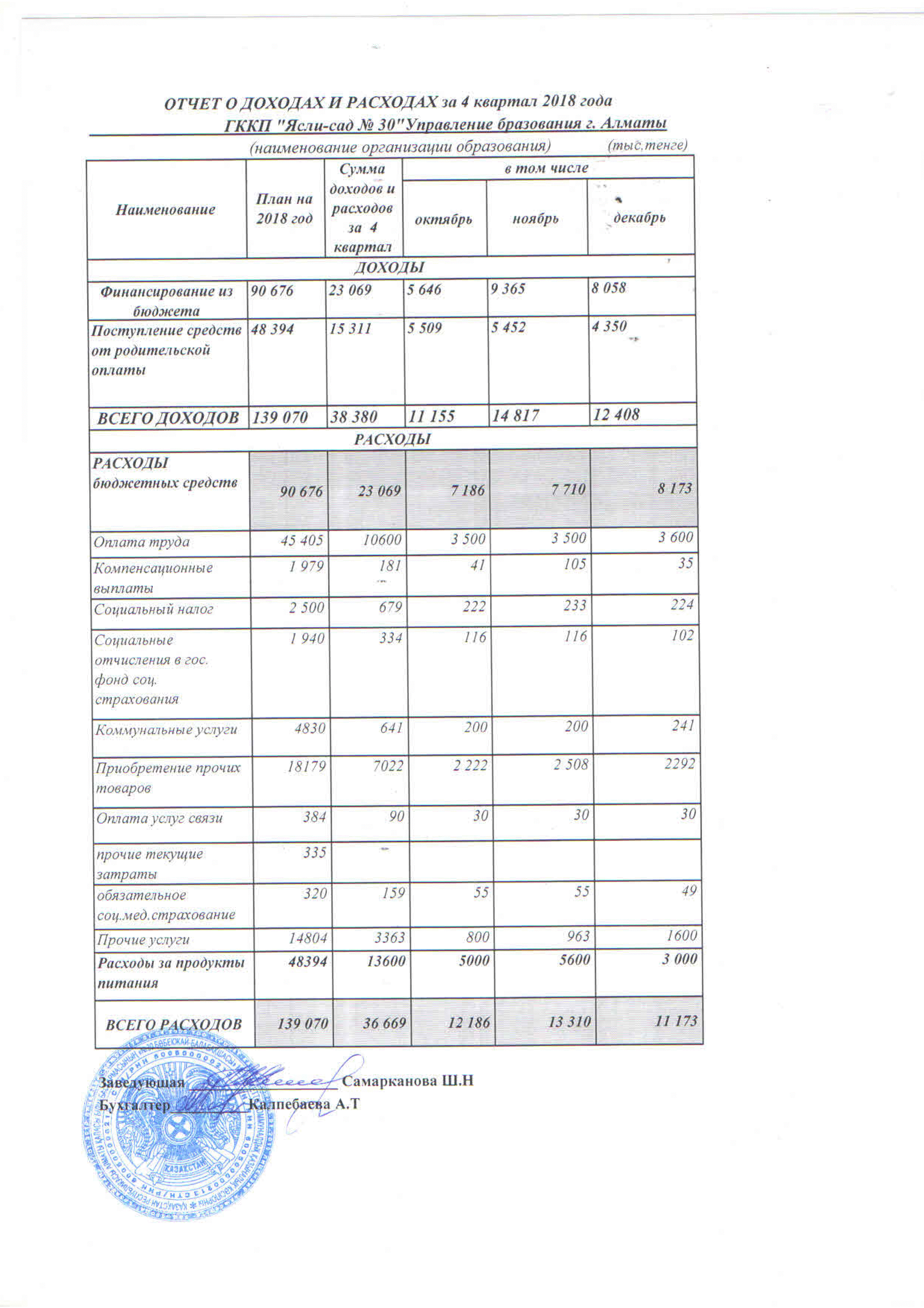 Отчет о доходах и расходах за 4 кв 2018 » КГКП "Ясли сад №30". мемлекеттік балабақшасы