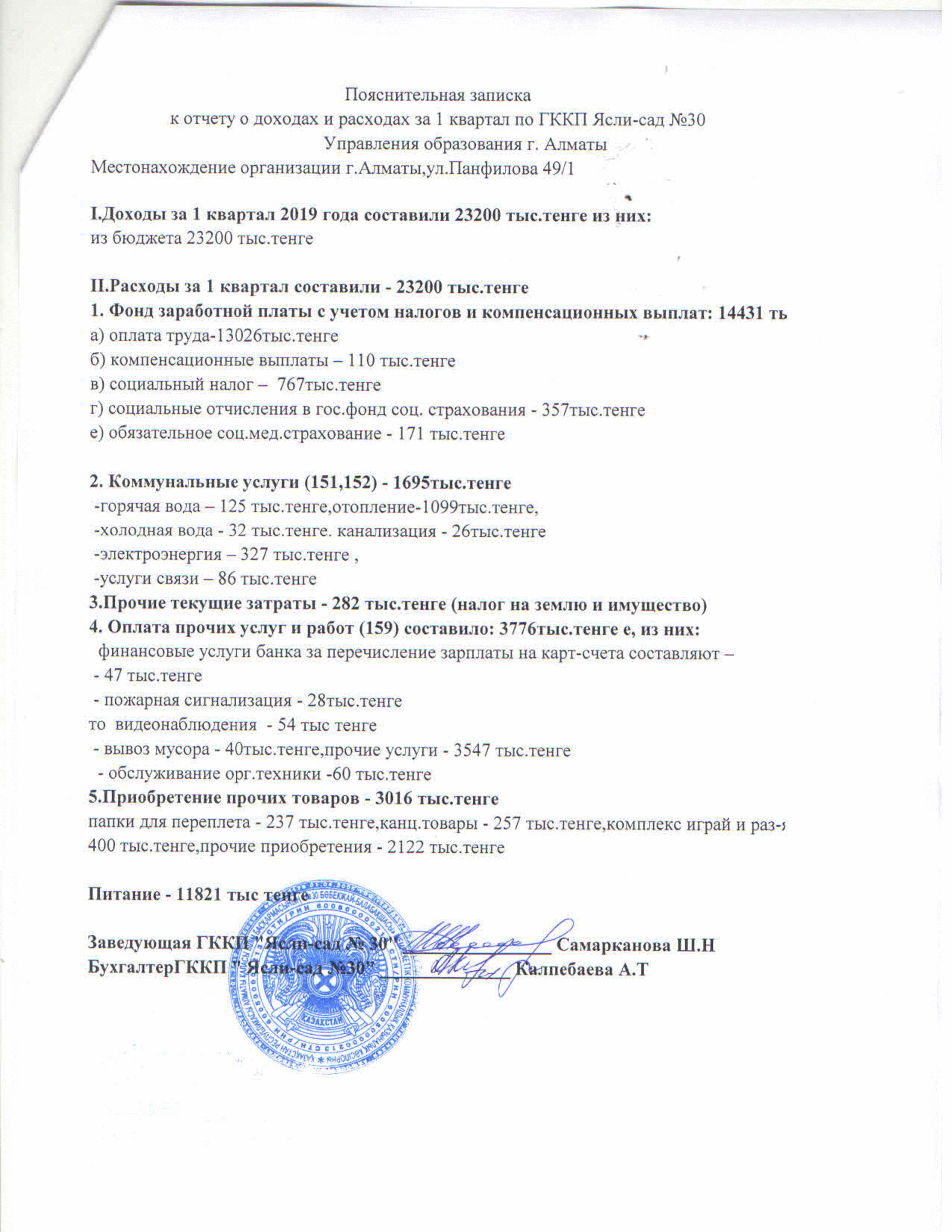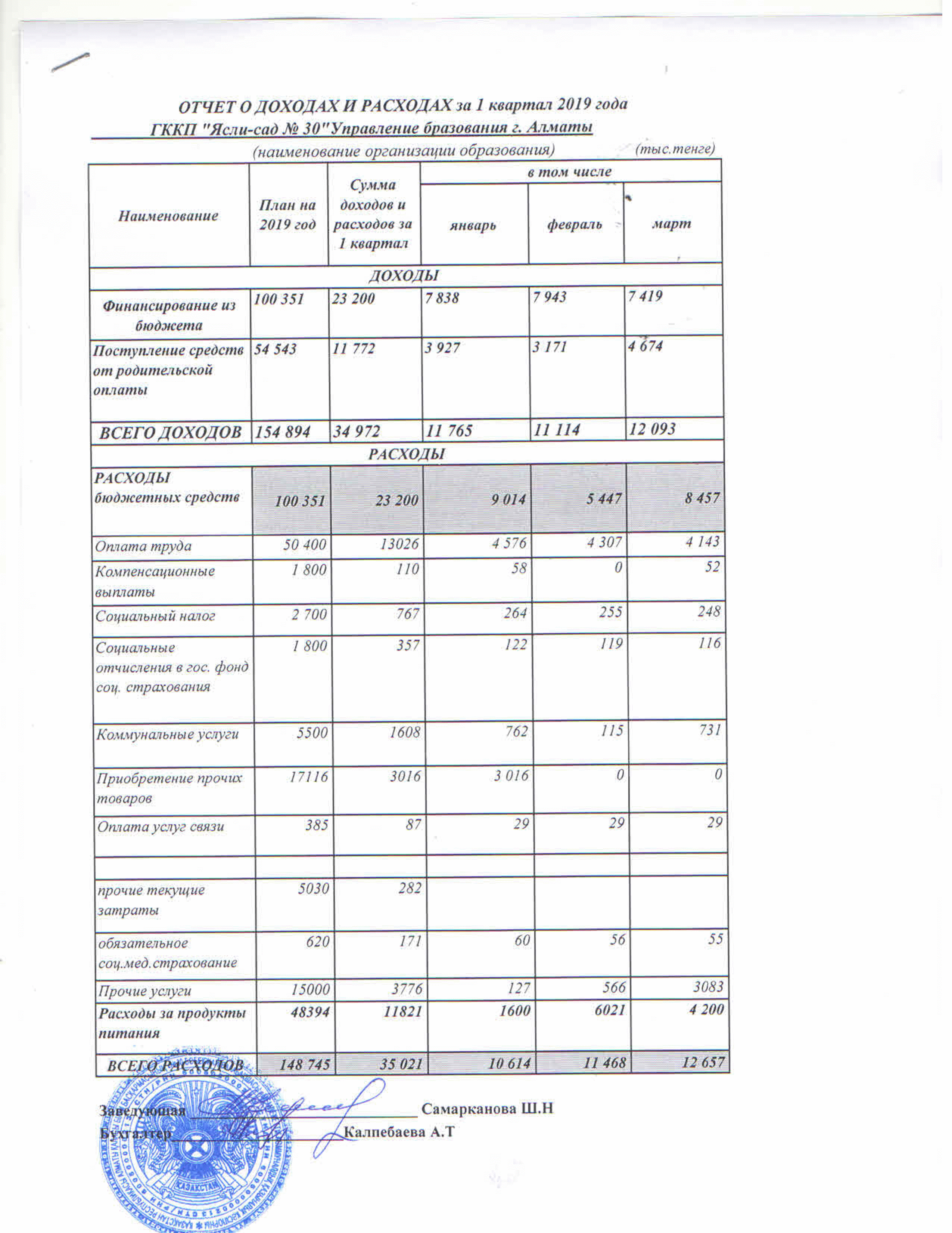 Отчет о доходах и расходах за 1 кв 2019 » КГКП "Ясли сад №30". мемлекеттік балабақшасы