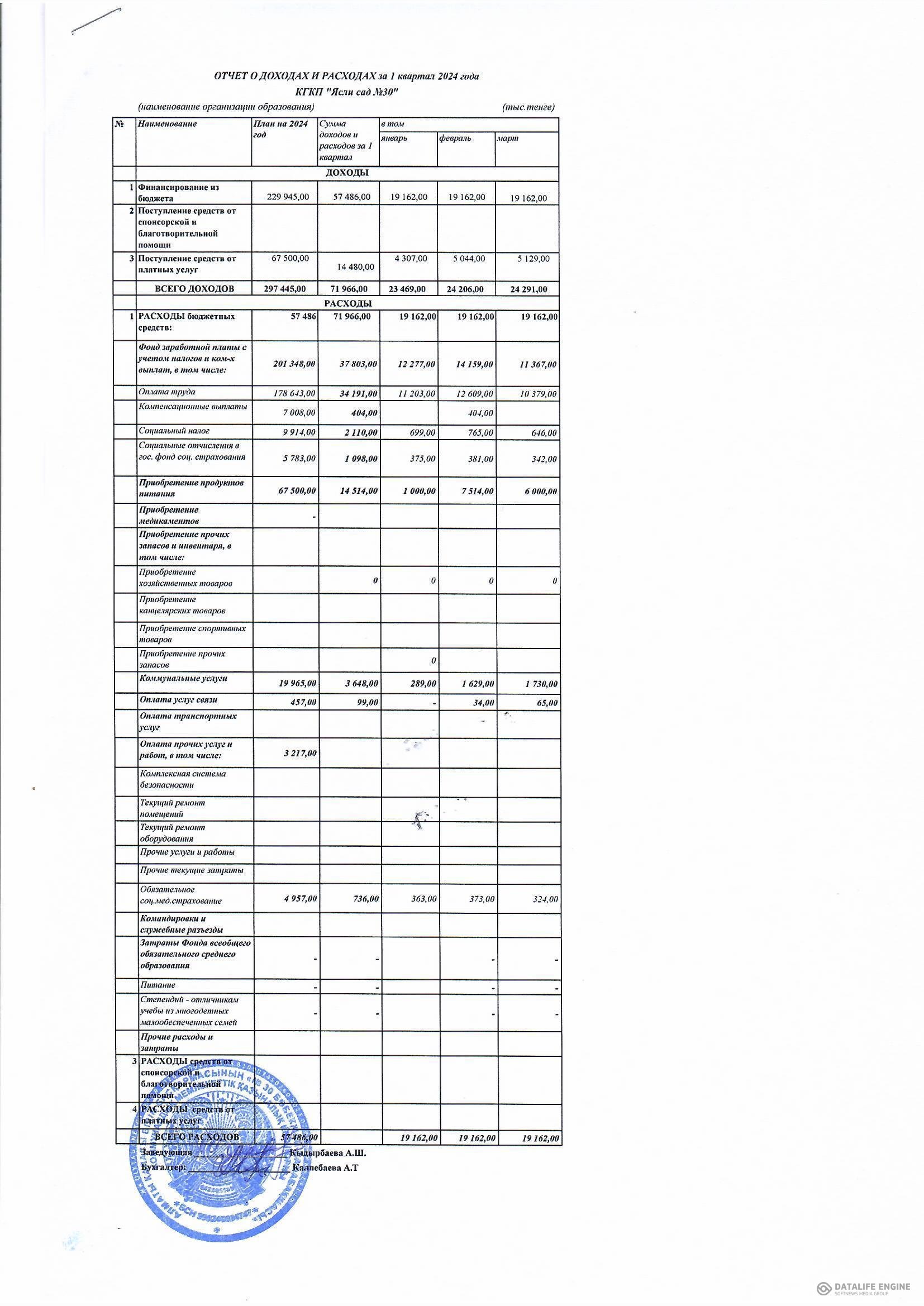 Кіріс шығыс есебі 2024 жыл 1 тоқсан » КГКП "Ясли сад №30". мемлекеттік балабақшасы