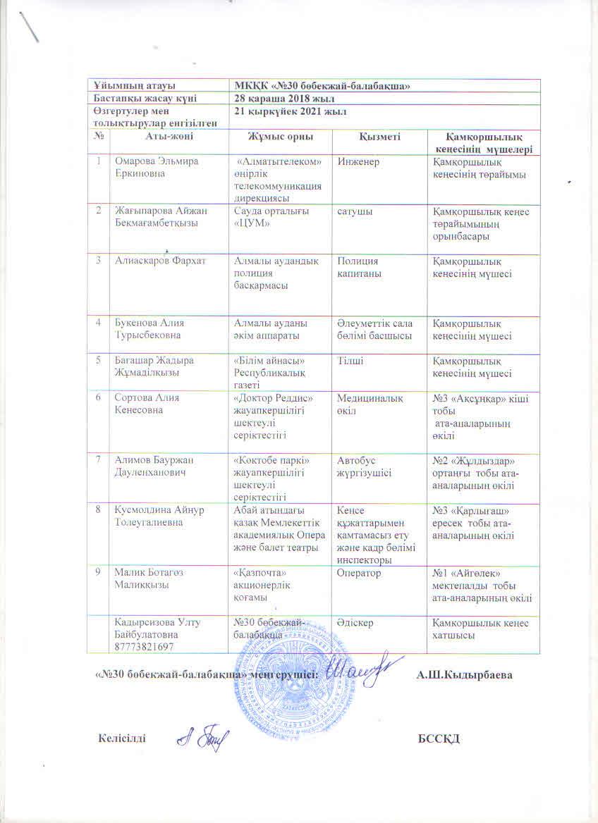 Қамқоршылық кеңес құрамы 2021-2022 оқу жылы » КГКП "Ясли сад №30". мемлекеттік балабақшасы